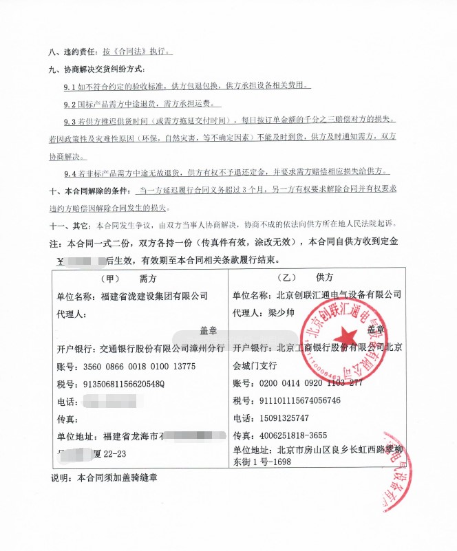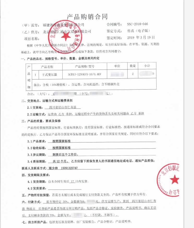 2019年3月19日福建省泷建设集团有限公司与我司签订产品购销合同,合同编号为SSC-2018-046。订购10KV干式变压器2台,型号为SCB13-1250KVa/10-0.4,使用于四川眉山某项目。